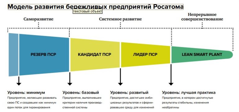 Базовая модель развития бережливых предприятий в Росатоме была сформирована еще в 2015 году, когда началось системное развертывание Производственной системы Росатома (ПСР). Тогда эта модель состояла из четырех ступеней. На первой находились предприятия с неразвитой производственной системой, на второй — достигшие ПСР-минимума и зачисленные в резерв. Системно выполняя требования базового уровня, можно перейти на третью ступень и стать ПСР-кандидатом. На четвертой ступени — лидеры ПСР. Основные критерии статуса: выполнение бизнес-показателей по снижению затрат, запасам и производительности труда, создание ПСР-образцов на уровне лучших мировых практик в области организации производства, реализация проекта по внедрению ПСР как минимум у одного поставщика и т. д.